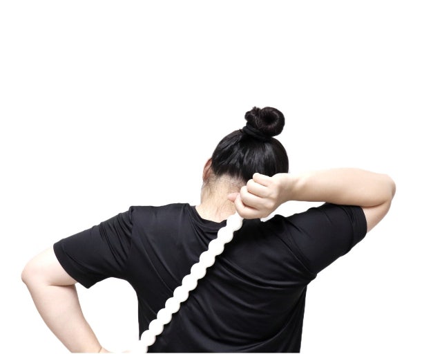 수건 양 끝을 잡고 뒤로 돌려 양손으로 당기며 스트레칭. 유착된 어깨 조직을 풀어주는 데 도움.